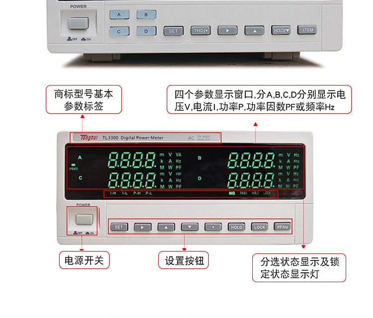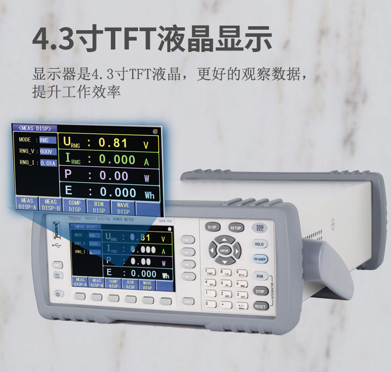 TH3300系列數字功率計采用了小機箱設計,便于機架安裝;配備4.3寸液晶屏顯示,測試功能與測量參數更為豐富,并提供兩種顯示風格界面:數碼管的四窗口顯示;全參數全屏顯示。