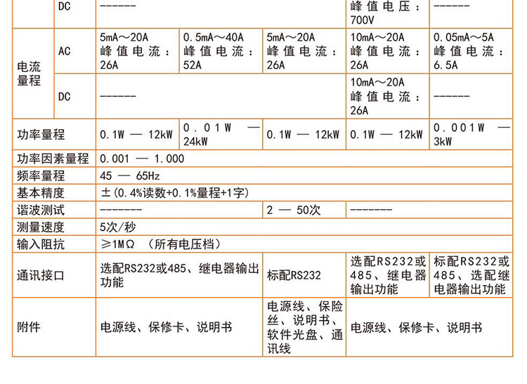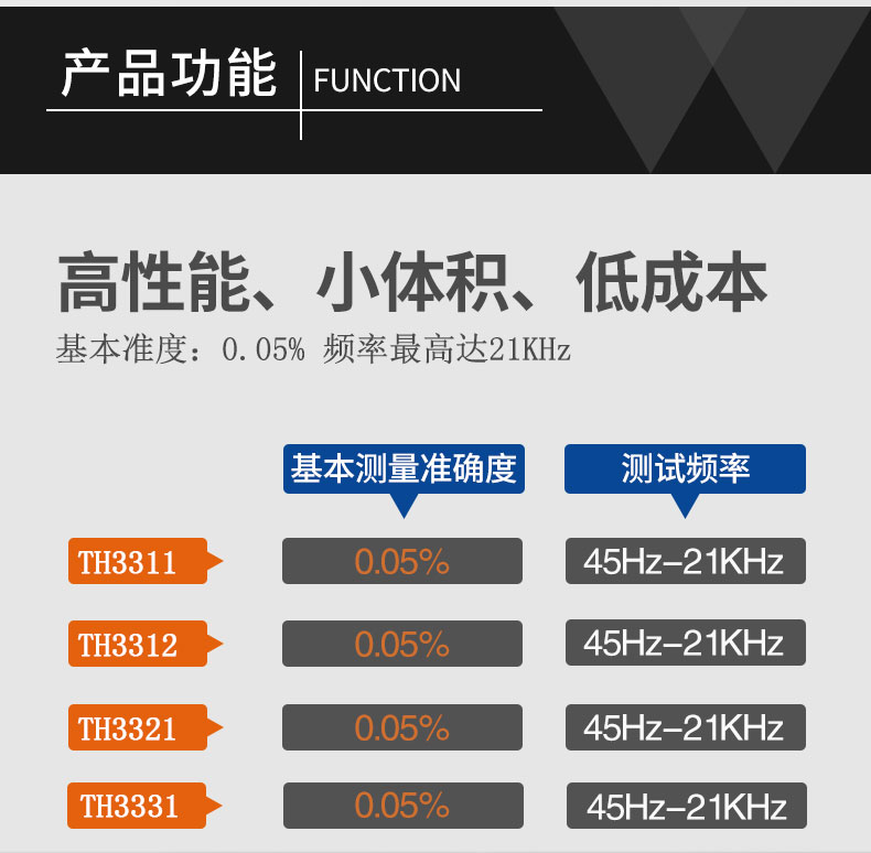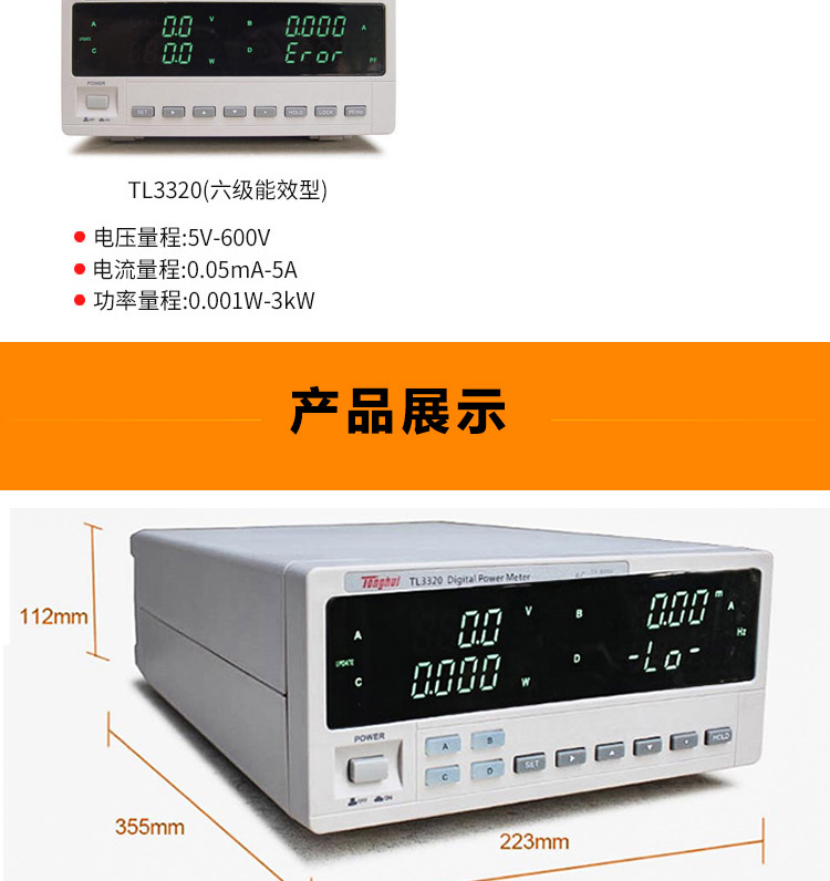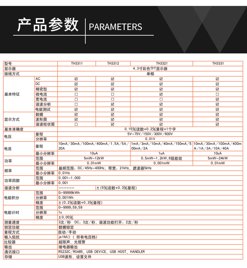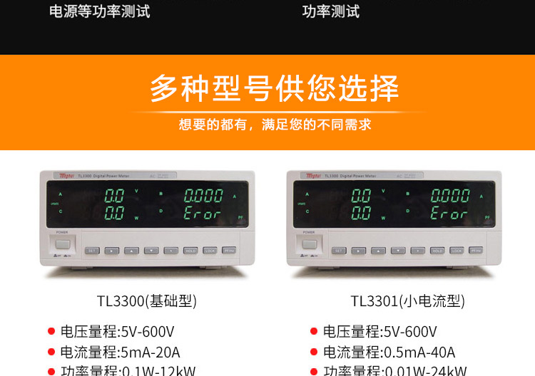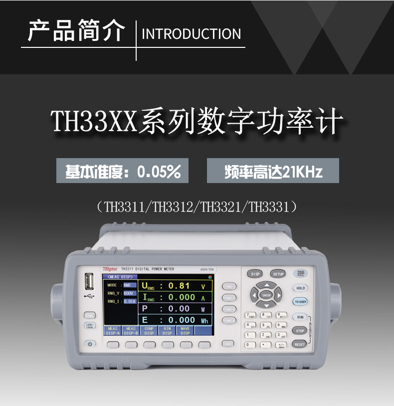 TH3300系列數字功率計電流測試范圍涵蓋較廣,小到幾微安大到40Arms均可測量,可測量包含交直流成分的輸入信號。測量應用范圍包括待機功耗的微小電流到電磁爐的大電流;