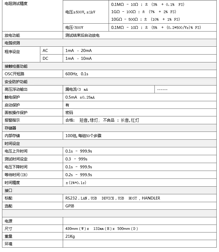 | 快速放電功能 | 測試結束后自動放電(DCW) |