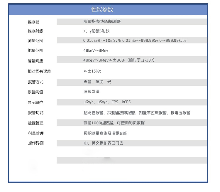 報警功能:超閾值報警、探測器故障報警、劑量率過載報警、低電壓報警